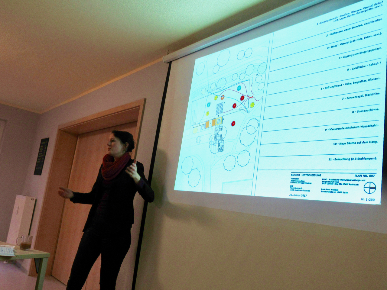 Begonnen wurde die Initiative mit einem großen Fest der Ideen direkt auf der Freifläche. Hier konnten die Bewohnerinnen schon erste Ideen entwickeln. Weiter ging es in einem langen Prozess mit mehreren Workshops in denen die Ideen weiter sortiert und gefestigt wurden. Danach wurde mit Hilfe eines Fachmannes ein umfangreicher Flächennutzungsplan erarbeitet. Zwischenzeitlich haben wir gemeinsam mit der RUWO, dem Flächeneigentümer und der Stadt einen Antrag im Rahmen des Förderprogrammes „Soziale Stadt“ gestellt und auch nach langer Wartezeit genehmigt bekommen.