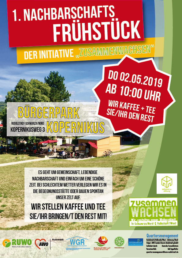Ab 2019 beteiligt sich unser Quartier am bundesweiten "Tag der Nachbarn". Da dieser immer im Mai stattfindet, verbinden wir den Tag mit einem Nachbarschaftsfrühstück und unseren Frühlingsfest. Das ist eine gute Fügung und führt zu mehr Beachtung und Selbstbewusstsein im Quartier. Danke an das nebenan-Team.