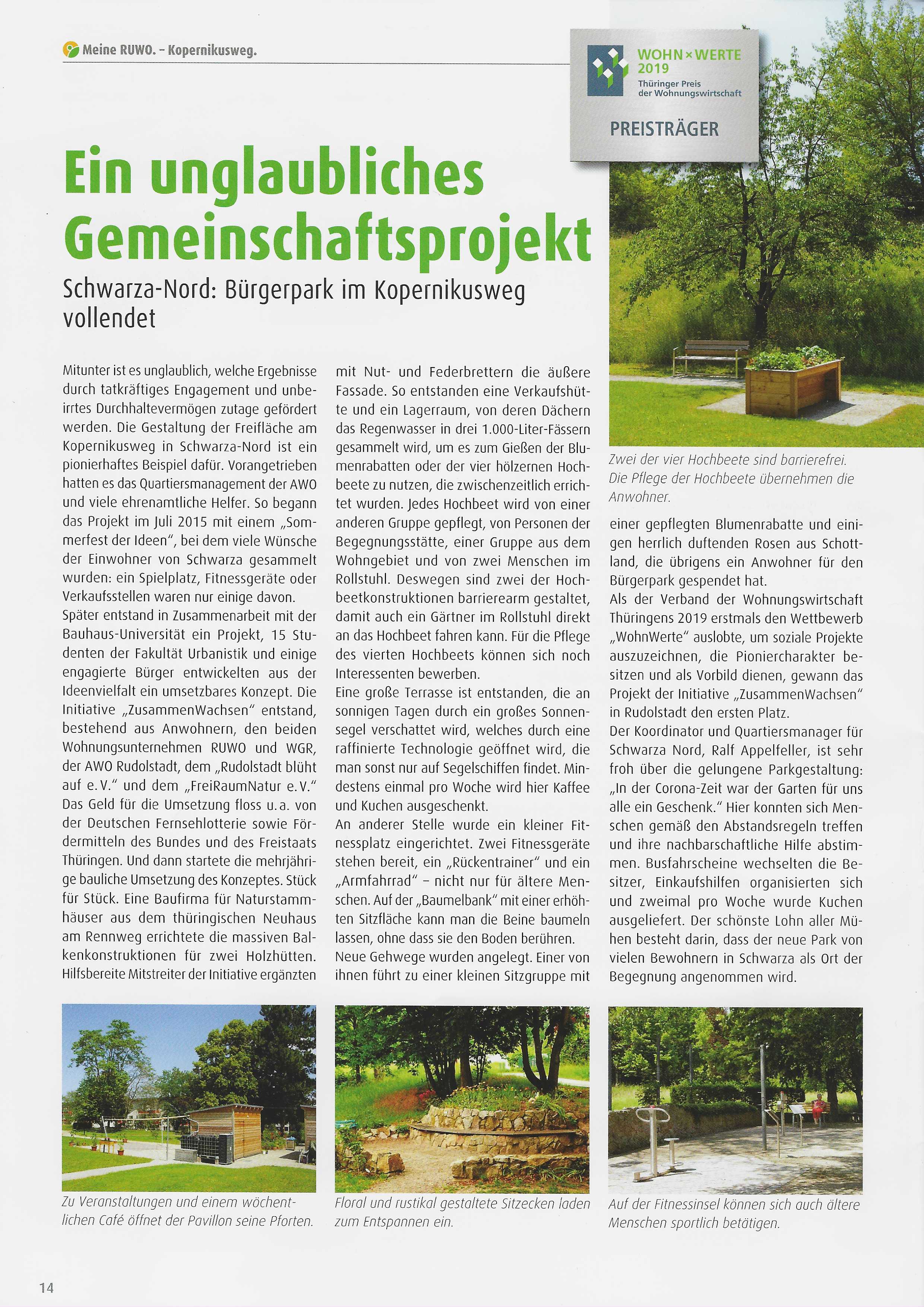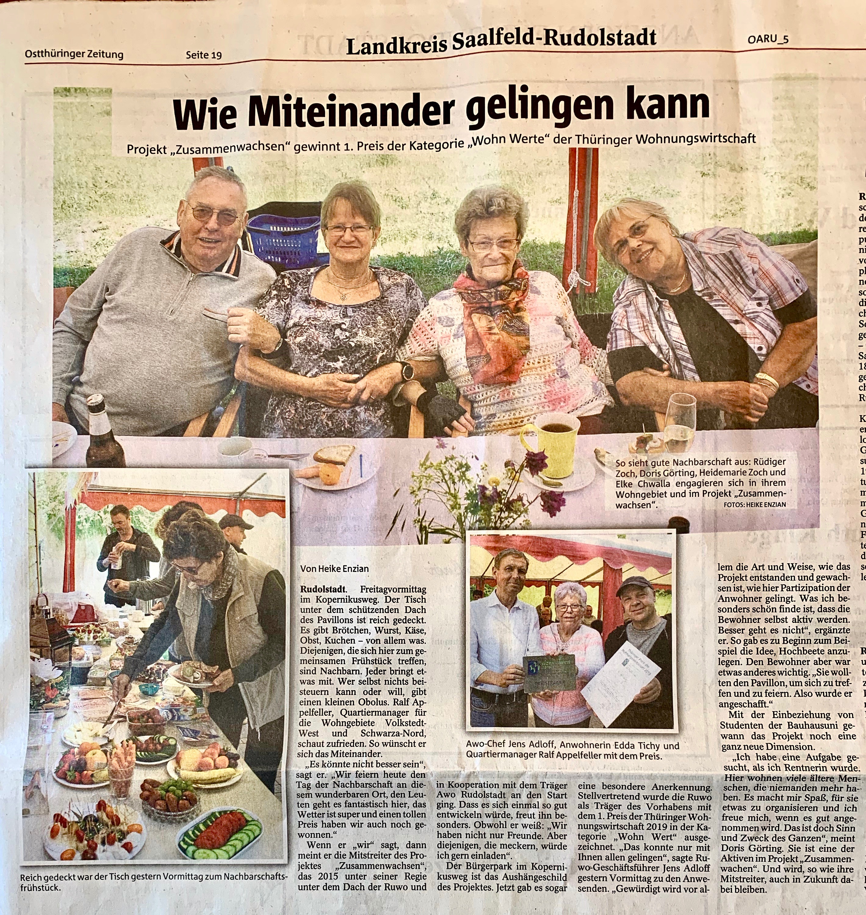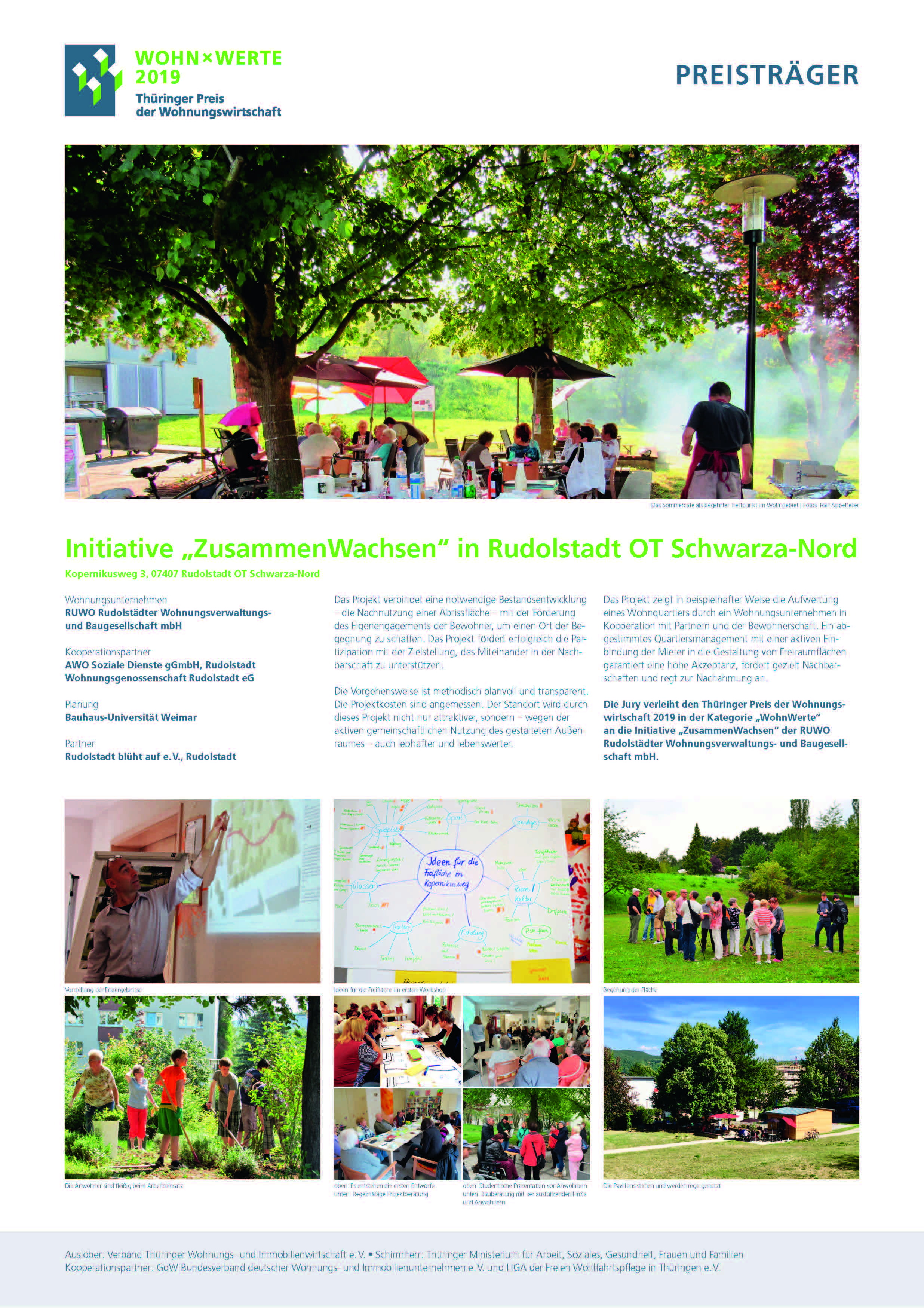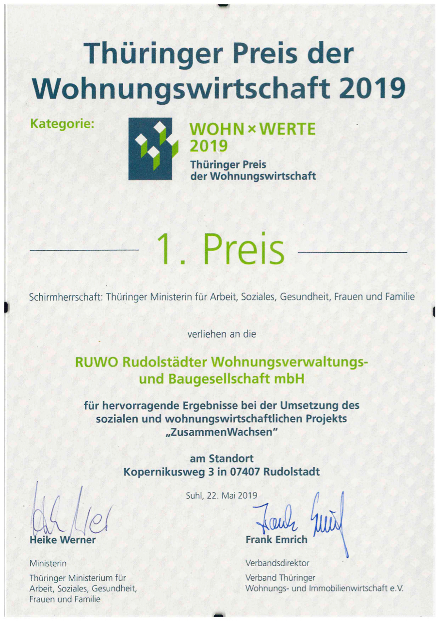 Am 22.05.2019 bekam die RUWO stellvertretend für die gesamte Initiative "ZusammenWachsen" den 1. Thüringer Preis der Wohnungswirtschaft für das beispielhafte Engagement bei der Schaffung von lebenswerten Wohnräumen unter Bürgerbeteiligung. Über diese Wertschätzung der geleisteten Arbeit haben sich alle Beteiligten sehr gefreut und sich gleich hochmotiviert an die Weiterentwicklung gemacht.