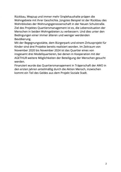Unser Quartier wird eins von insgesamt drei Modellquartieren bei dem die AGETHUR behilflich ist mit allen Beteiligten des Quartiers gemeinsam und zukunftsorientiert, sowie partizipativ die weitere Entwicklung zum Vorteil Aller zu entwickeln. Herzlichen Glückwunsch!!