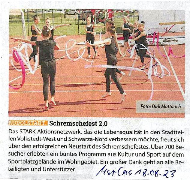 Das Fest fand am 24.06.2023 mit Hilfe des neu gestarteten Projektes A.S.T.A "Gemeinsam älter werden!" auf dem Gelände der Schremsche Sportanlage erfolgreich statt. Es kamen über 700 Besucher*innen und es waren über 70 Ehrenamtliche im Einsatz.